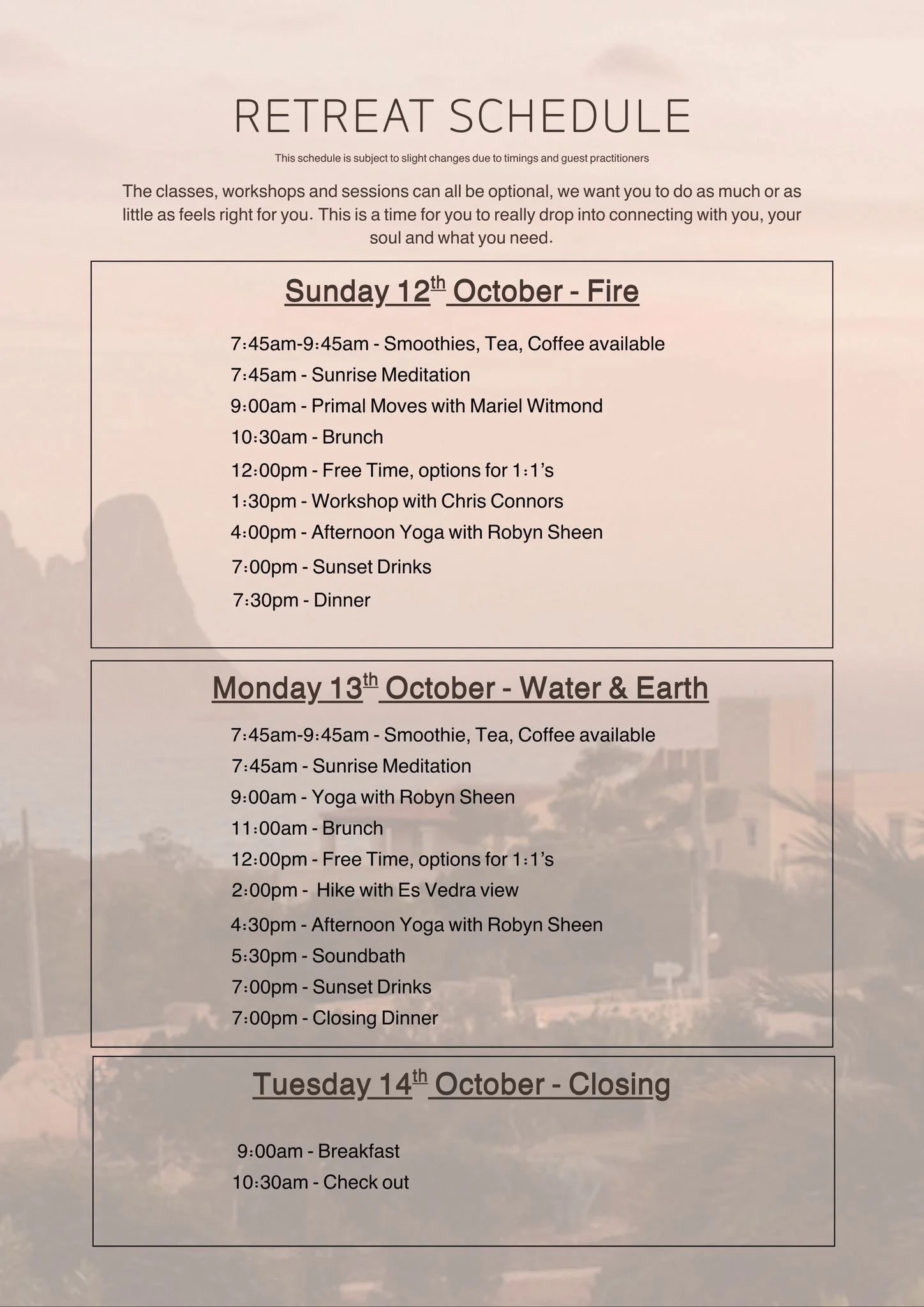 Hosted at the serene and beautiful UNIO Hotel - tucked into the wild, magnetic south of the island, and within the radiant presence of sacred Es Vedrà - each day unfolds with a carefully curated blend of yoga, meditation and sound healing. Nourishing seasonal food grounds the experience, with the option to deepen your journey further through personalised holistic treatments.