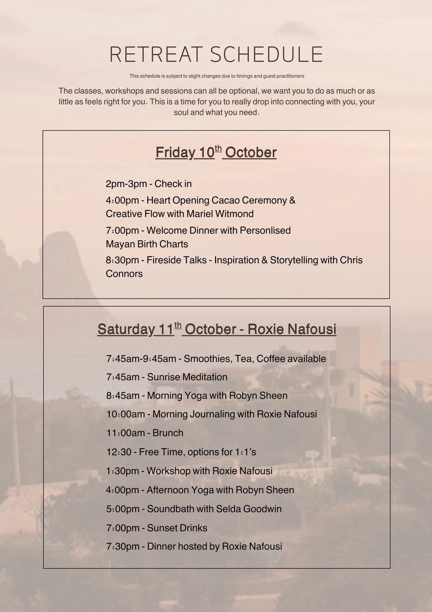 We are excited to welcome Roxie Nafousi for a beautiful day including a journaling session, manifestation workshop and a soul-nourishing themed dinner under the stars